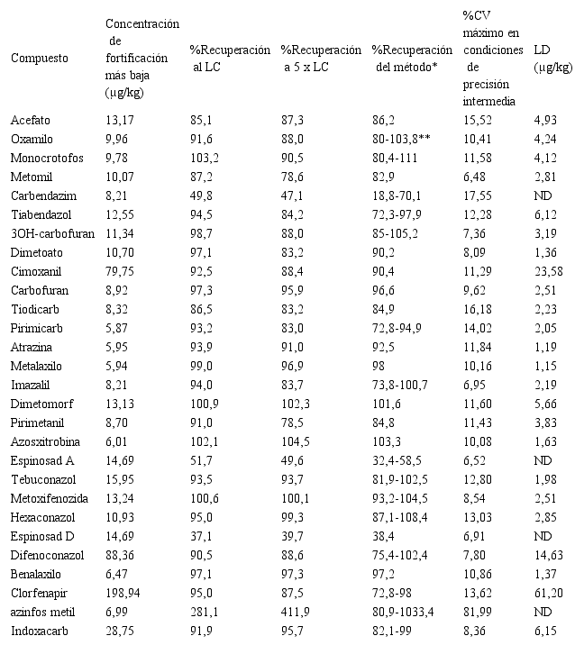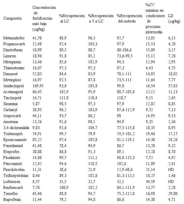 Por otro lado, se encontró que el máximo %CV para cada uno de los analitos, en general, es inferior al 15%, lo cual cumple con el criterio de la Unión Europea (21). Sin embargo, para algunos compuestos se observa que este %CV supera el 15%, pero debe tenerse en cuenta que el criterio de la Unión Europea se establece para compuestos en condiciones de repetibilidad, y que el %CV presentado en las Tablas 3 y 4 se obtiene para condiciones de precisión intermedia (interanalistas). Por lo tanto, se considera que para todos los casos el método es preciso, a excepción de los casos en los que el método no es selectivo (tiociclam y metil azinfos) o presenta una recuperación inadecuada (menor al 70%).