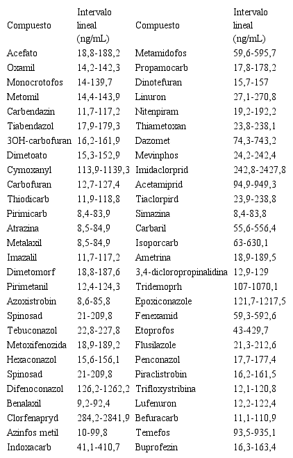 Se realizó un proceso de evaluación de efecto matriz previo a la cuantificación de cada analito. Se encontraron porcentajes de efecto matriz entre 69% y 130%, resultados que concuerdan con estudios previos (17, 20). Por lo anterior se realizaron también diferentes niveles de calibración en blancos de matriz. Para el caso de los ensayos de recuperación, se cuantificó con un solo punto de calibración, de acuerdo a las recomendaciones del documento SANTE (20). Para la evaluación de la linealidad del sistema, se preparon las curvas de calibración que estaban compuestas por seis puntos de calibración en blanco de matriz, cada uno de ellos se inyectó cuatro veces en el sistema analítico; los puntos se distribuyeron equidistantemente.