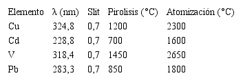 Los metales (Cu, Cd, V y Pb) fueron determinados utilizando la técnica de espectroscopia de absorción atómica con horno de grafito (22), usando el equipo Perkin Elmer 3110. Las condiciones de operación se encuentran indicadas en la Tabla 1.