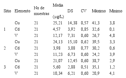 En la Tabla 2 se presenta el resumen estadístico de las concentraciones de los metales Cu, V y Cd medidos en las muestras de agua de lluvia que presentaron valores por encima del límite de detección (0,02 µg/L para cada elemento).