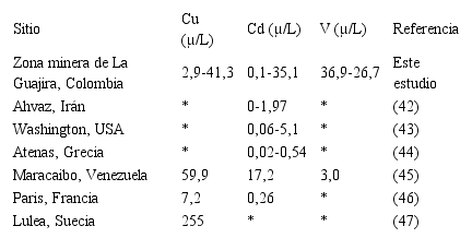 Al comparar la concentración de Cd y V medidos en la lluvia en la zona minera de La Guajira (Tabla 3), se observa que son más altas que las reportadas en otras regiones del mundo, lo cual podría ser consecuencia de la ubicación de la zona de estudio en la región de calma ecuatorial que separa los movimientos de las masas de aire en los dos hemisferios. Esto dificulta el intercambio de contaminantes entre hemisferios, causando cierta asimetría en la distribución de dichos contaminantes (38). También es de considerar que la presencia y concentración de metales en la atmósfera de La Guajira se ve influenciada por el movimiento de las corrientes marinas cálidas en la costa norte de Colombia, la intensidad de los vientos alisios del noreste y la presencia de cadenas montañosas en la zona sur que detienen los vientos.