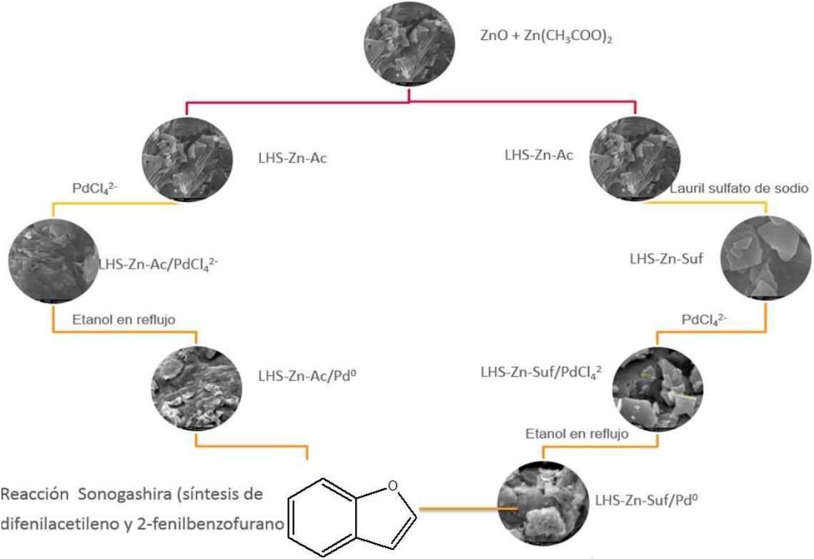 Con la expectativa de que las moléculas de surfactante actúen como plantilla para aumentar el espacio interlaminar, el área superficial y la lipolificidad de las hidroxisales laminares de este estudio, similar a como se reportó en hidróxidos dobles laminares (20), se sintetizaron dos nuevos materiales laminares con nanopartículas de paladio soportadas (LHS-Zn-Ac/Pd0 y LHS-Zn-Suf/Pd0), mediante una modificación del procedimiento reportado por Martínez y colaboradores (21).