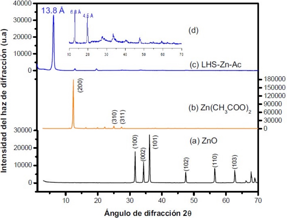 En la Figura 2 se muestran los patrones de difracción de rayos X de los materiales de partida, ZnO y Zn(CH3COO)2 así como el material sintetizado reportado en la literatura (21). Al comparar los patrones de difracción del ZnO y Zn(CH3COO)2 con la Figura 2c (LHS-Zn-Ac) se observa la formación de un nuevo material laminar producto de la reacción entre éstos. El pico observado para LHS-Zn-Ac (Figura 2c) indica un tipo de reflexión que revela la formación de un espacio interlaminar correspondiente a 13,8 Å. Este espacio interlaminar es igual al reportado por Martínez y colaboradores (13,8 Å) (21). Los picos que aparecen correspondientes a 6,8 Å y 4,5 Å son asignados al segundo y tercer orden de reflexión del espaciamiento interlaminar, respectivamente.