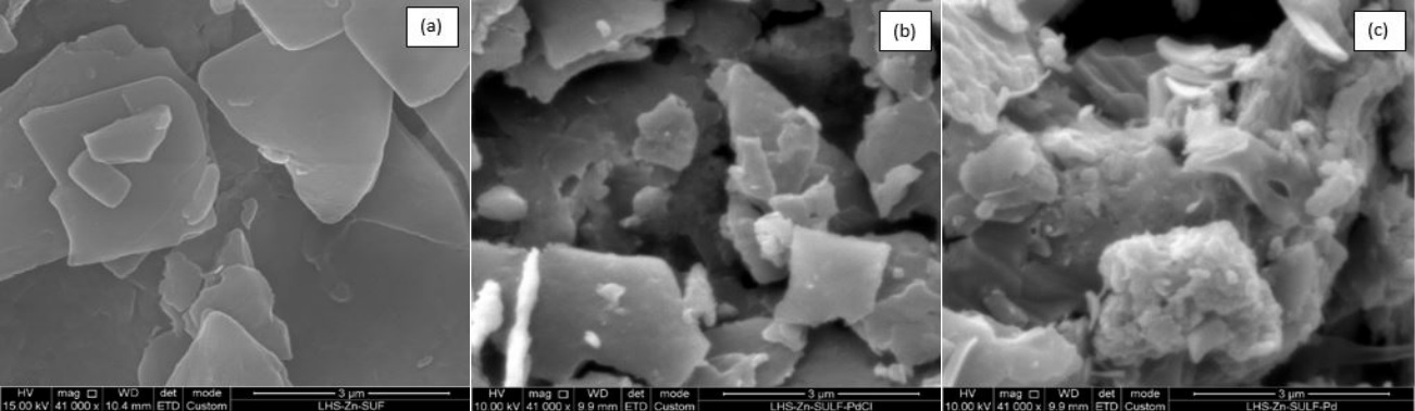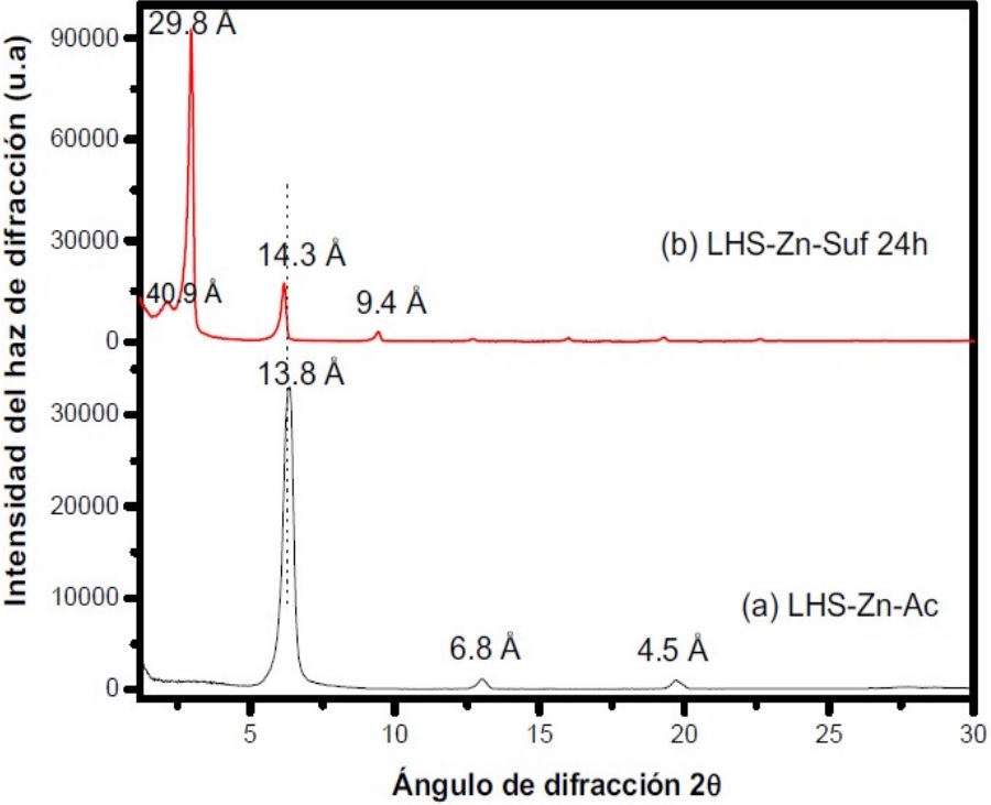 El análisis por XRD de ambos materiales evidenció las estructuras laminares de acuerdo a los planos de difracción y modificaciones en el espacio interlaminar. Así, el material LHS-Zn-Ac mostró una distancia interlaminar de 13,8 Å. Cuando se realizó el intercambio con el anión laurilsulfato (LHS-Zn-Suf) aumentó el espacio interlaminar hasta 29,8 Å y, al intercambiarse con [PdCl4]2- (LHS-Zn-Suf/[PdCl4]2-), aumentó a 31,4 Å. Finalmente, una vez se redujo este material y se preparó LHS-Zn-Suf/Pd0 se observó una interlámina con una distancia de 29,4 Å.