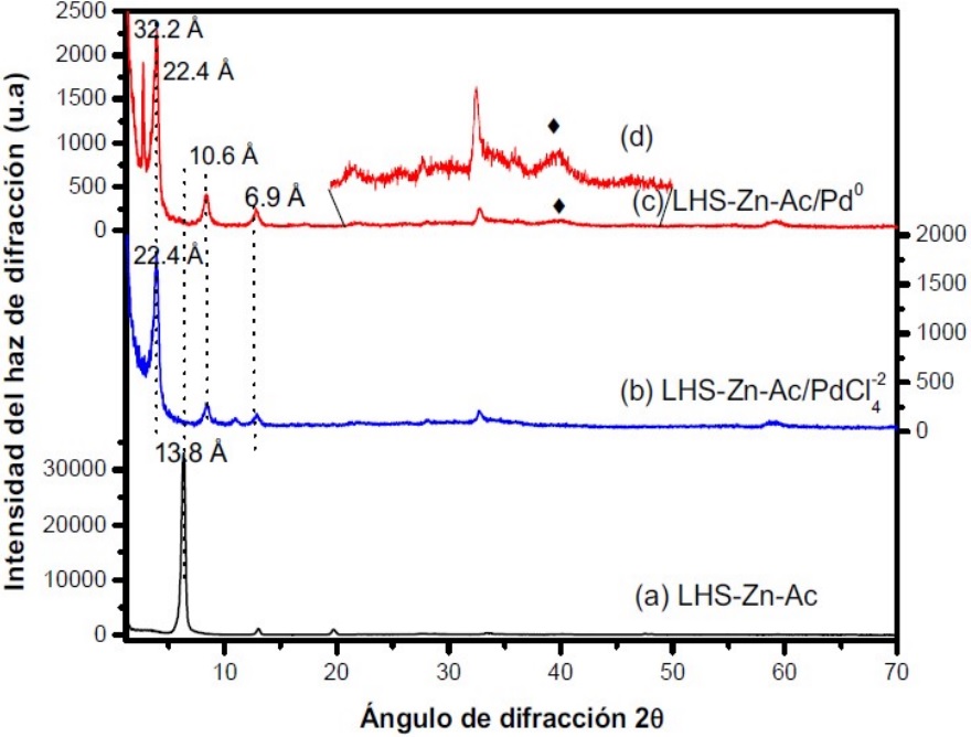 Con respecto al intercambio del LHS-Zn-Ac con [PdCl4]2- (LHS-Zn-Ac/[PdCl4]2-), se evidenció un cambio en el espacio interlaminar de 13,8 Å a 22,4 Å, el cual se mantuvo al hacer la reducción (LHS-Zn-Ac/Pd0). Lo anterior se debe posiblemente a la falta de reducción total del [PdCl4]2- o la presencia de nanopartículas con un tamaño inferior a 2 nm en la interlámina.