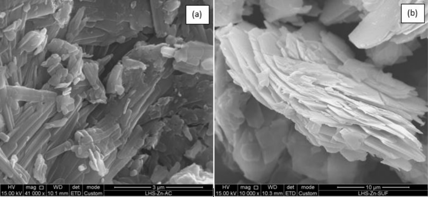 La Figura 6 muestra la morfología del material precursor (LHS-Zn-Ac) y el material intercambiado con laurilsulfato (LHS-Zn-Suf). Las microfotografías de ambos materiales evidencian la formación de láminas u hojuelas que se van modificando cuando se les inserta otras especies.