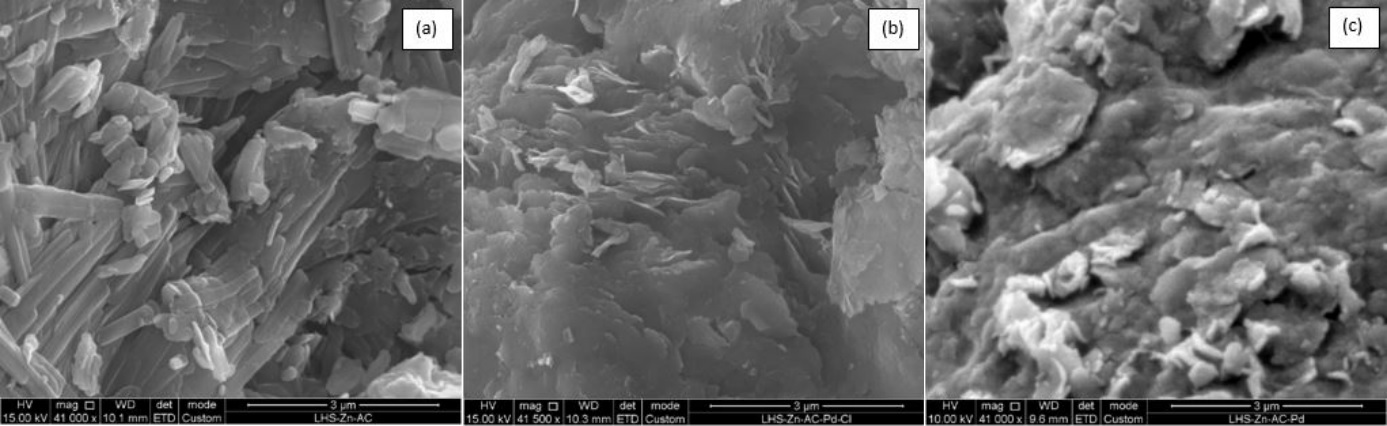 Los espectros infrarrojos con transformada de Fourier (FT-IR) de los materiales (a) LHS-Zn-Ac (b) LHS-Zn-Ac/[PdCl4]2- y (c) LHS-Zn-Ac/Pd0 se muestran en la Figura 10, y los datos de cada señal se presentan en la Tabla 2. Además de las señales esperadas para enlace C-H (29, 31), se observa una banda ancha e intensa en la región de 3600-3000 cm-1, asignada a los modos vibracionales del grupo hidroxilo (OH) en el material inorgánico y de las moléculas de agua (31). Particularmente, en el espectro FT-IR del precursor LHS-Zn-Ac se observan tres bandas de absorción a 3396, 3482 y 3573 cm-1. Mediante espectroscopia Raman, estas señales se han atribuido a los grupos OH de las láminas inorgánicas de las posiciones octaédricas o tetraédricas de la hidroxisal (29).