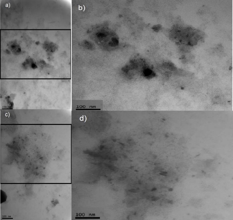 La formación de nanopartículas de paladio soportadas en los materiales laminares en la reducción de los precursores que contienen [PdCl4]2- bajo reflujo en etanol, observadas en los difractogramas (Figuras 4c y 5c), se puede confirmar mediante la técnica de microscopía electrónica de transmisión, (TEM según su sigla en inglés), Figuras 9a y 9c. Las respectivas imágenes muestran las fotografías de las nanopartículas de paladio metálico con un tamaño menor de 10 nm, un valor similar al reportado en la literatura (30). Probablemente este tamaño también se deba a la aglomeración de muchas nanopartículas de paladio en algunas áreas, dado que adicionalmente se observan partículas mucho más pequeñas en otras áreas.