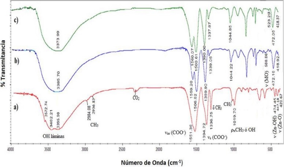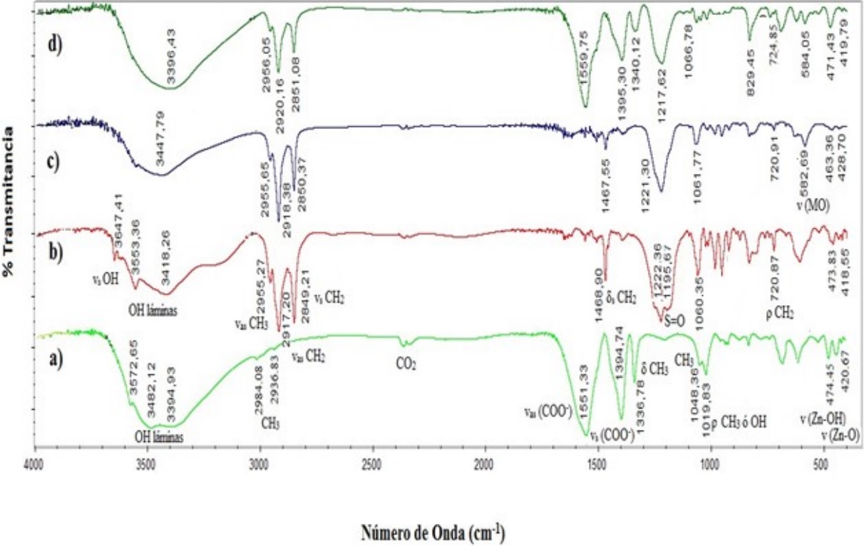 Una relación más detallada y comparativa de las diferentes señales exhibidas por todos los materiales estudiados y su respectiva asignación se presenta en la Tabla 4. Estos valores son muy similares a los reportados por Menezes al utilizar laurilsulfato y mostrar una señal a 1222 cm-1 (38, 39). Las señales por debajo de 900 cm-1 son vibraciones de la estructura laminar que involucran el catión metálico como vibraciones Zn-O y Zn-OH (36).