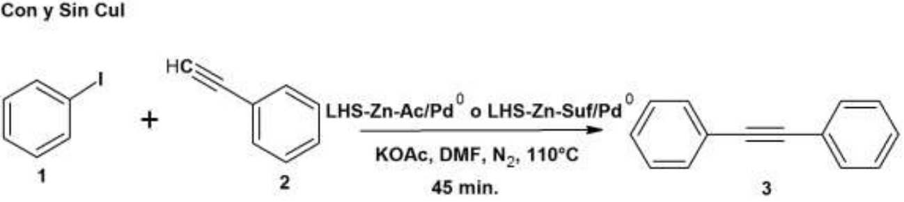 En un balón de tres bocas de 25 mL se mezclaron 114 µL de yodobenceno (1 mmol), 140 µL de fenilacetileno (1,25 mmol), 147 mg de KOAc (1,5 mmol) y 50 mg de catalizador (LHS-Zn-Ac/Pd0 o LHS-Zn-Suf/Pd0) en 2 mL de N,N-dimetilformamida (DMF), bajo atmósfera de nitrógeno. La mezcla de reacción se agitó a 500 rpm, controlando la temperatura de reflujo entre 110-112 °C durante 45 min. Se realizó el seguimiento de la reacción con TLC y GC-MS, luego la reacción se filtró con DMF y se realizó una extracción líquido-líquido con éter etílico-agua.