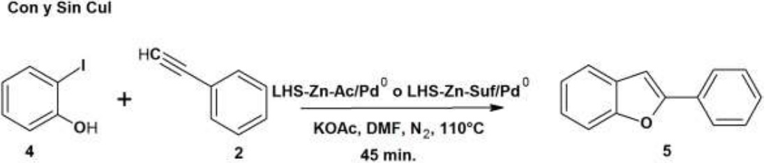 Cada uno de los materiales laminares sintetizados mostró actividad catalítica en la síntesis de difenilacetileno y 2-fenilbenzofurano. Cuando se utilizó LHS-Zn-Ac/Pd0 y CuI (como co-catalizador) se obtuvieron rendimientos del 32% de difenilacetileno y 18% de 2-fenilbenzofurano, mientras que con LHS-Zn-Suf/Pd0 y CuI los rendimientos obtenidos fueron del 30% y 17% respectivamente. En ausencia de CuI, los rendimientos fueron menores (30% de difenilacetileno y 15% 2-fenilbenzofurano con LHS-Zn-Ac/Pd0 y 28% y 11% respectivamente con LHS-Zn-Suf/Pd0)