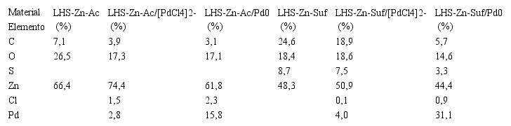 Finalmente es importante volver a mencionar que una estimación cualitativa del contenido de paladio metálico contenido en las hidroxisales LHS-Zn-Ac/Pd0 y LHS-Zn-Suf/Pd0 se deriva de los resultados del estudio por SEM, que muestra contenidos aproximados del 16% de paladio reducido en LHS-Zn-Ac/Pd0 y 31% en LHS-Zn-Suf/Pd0, datos tomados en los puntos de mayor aglomeración de partículas metálicas. Sin embargo, estos resultados son solo una guía preliminar, entre otras razones porque los materiales son de naturaleza heterogénea y la metodología del análisis SEM permite censar regiones a criterio del analista. En esta circunstancia, los porcentajes suministrados no reflejan necesariamente el contenido cuantitativo de paladio en la totalidad del material y no se espera que haya estricta concordancia entre el contenido aparente de paladio y la actividad catalítica.