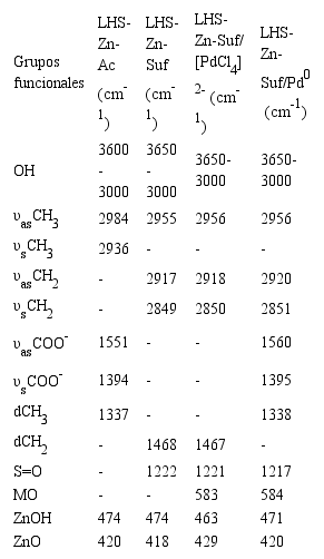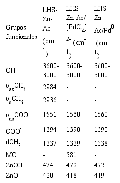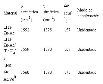 Igualmente, en relación con lo reportado en la literatura (32, 33), se observan claramente en todos los materiales las señales correspondientes a la vibración asimétrica y simétrica del grupo carbonilo (1560 cm-1 y 1430-1350 cm-1 respectivamente). En el presente trabajo se observa una señal a 1394 cm-1 para el LHS-Zn-Ac, pero de 1390 cm-1 para el material intercambiado y reducido (LHS-Zn-Ac/[PdCl4]2-, LHS-Zn-Ac/Pd0).