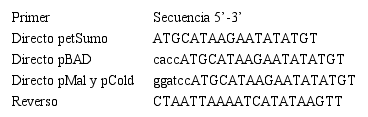 Se escogieron los cuatro vectores más promisorios en cuanto a solubilidad, teniendo en cuenta tres aspectos: expresión, solubilidad y purificación (13). Los cuatro vectores escogidos fueron: Champion™ pET SUMO (ThermoFisher), el cual le otorga la etiqueta de 6His+SUMO (His + SUMO); pCold TF DNA (Takara), que fusiona la etiqueta de 6His+Chaperona Trigger Factor (His + TF); pBAD202/D-TOPO (Invitrogen), fusiona la etiqueta de Tiorredoxina (Trx) y pMAL-c5X (New England Biolabs) que su proteína fusión es la proteína de unión a maltosa (MBP).