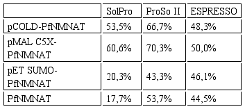Se implementaron tres programas bioinformáticos, SOLPro (14), PROSO II (15) y ESPRESSO (16), que estiman la solubilidad de la proteína recombinante expresada a partir del sistema heterólogo E. coli. Para esto, se tomó la secuencia primaria de la PfNMNAT (PF13_0159), unida a las diferentes etiquetas moleculares aportadas por los vectores de expresión, y se identificó la probabilidad de encontrar esta proteína en la fracción soluble.