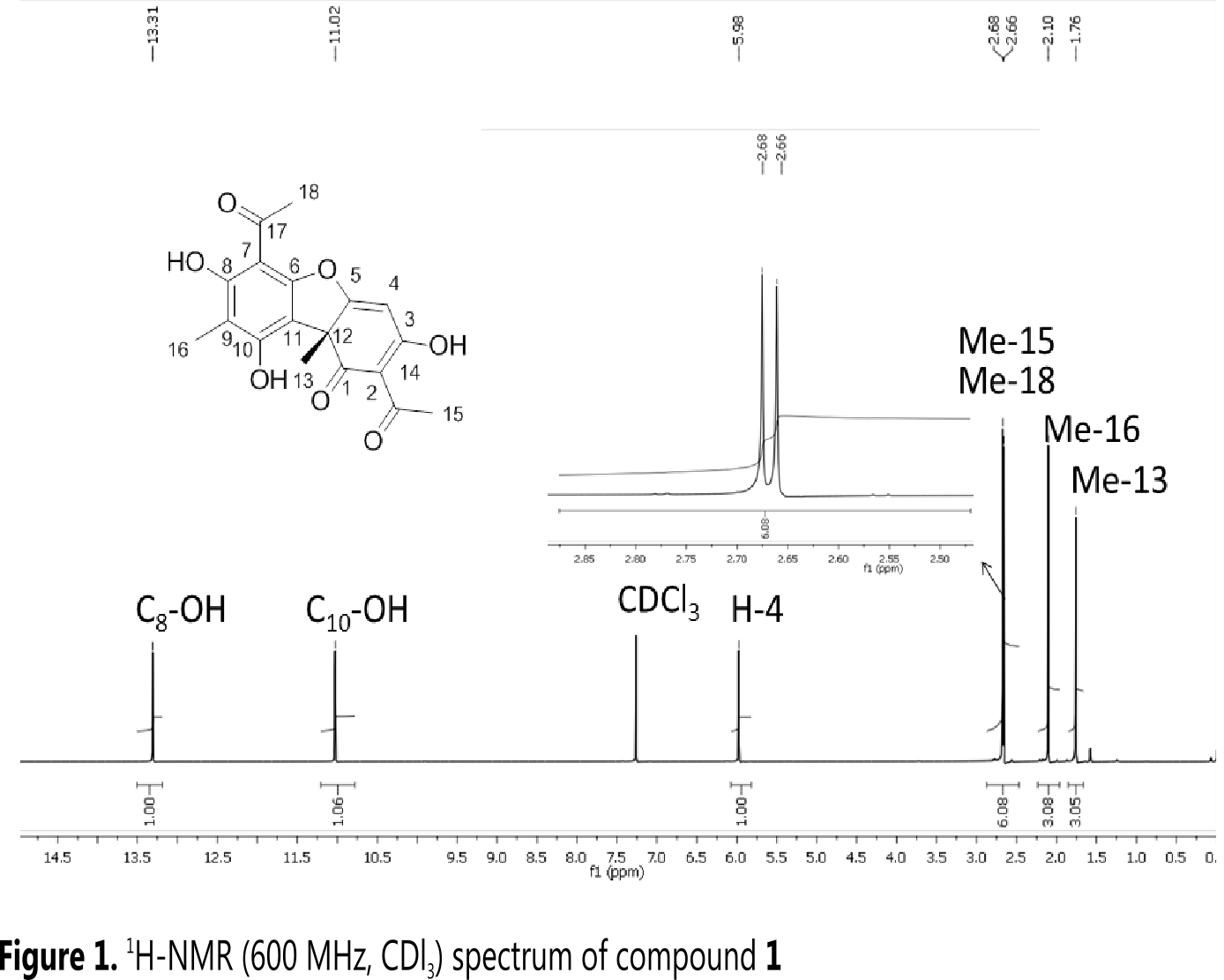 The 1H-NMR spectrum shows characteristic signals at δ 13.31 and δ 11.02 ppm corresponding to the hydroxyl groups C8-OH and C10-OH respectively; δ 5.97 ppm corresponding to the H-4 from the double bond; finally δ 2.67, 2.66, 2.10; and 1.75 ppm corresponding to the methyl substituents. The hydroxyl group C3-OH appears at 18.84 ppm (Figure 1).