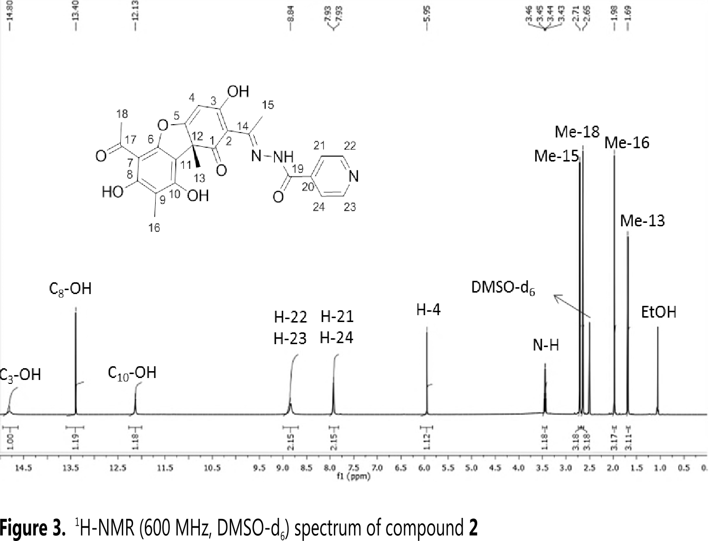 The comparison of 1H-NMR spectrum of usnic acid and acyl-hydrazone revealed that the chemical shift of C3-OH is due to the presence of the imine group in the structure; the presence of this amine group also influences the electron density of the methyl group (Me-15), which appears shifted to downfield (δ 2.68 to δ 2.71).