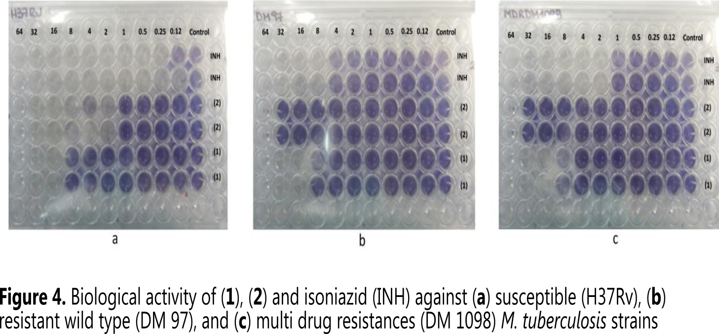The activity of isoniazid, usnic acid, and their acyl-hydrazone against susceptible (H37Rv), resistant wild type (DM 97) and multidrug resistances (DM 1098) M. tuberculosis strains were evaluated (Figure 4). The tetrazolium microplate assay was performed in duplicate (two rows) based on the methodology already mentioned (see Materials and methods part). The MIC values obtained by compound 1 provide a better prospect to be potentially active compared to compound 2, the results are shown in Table 1.