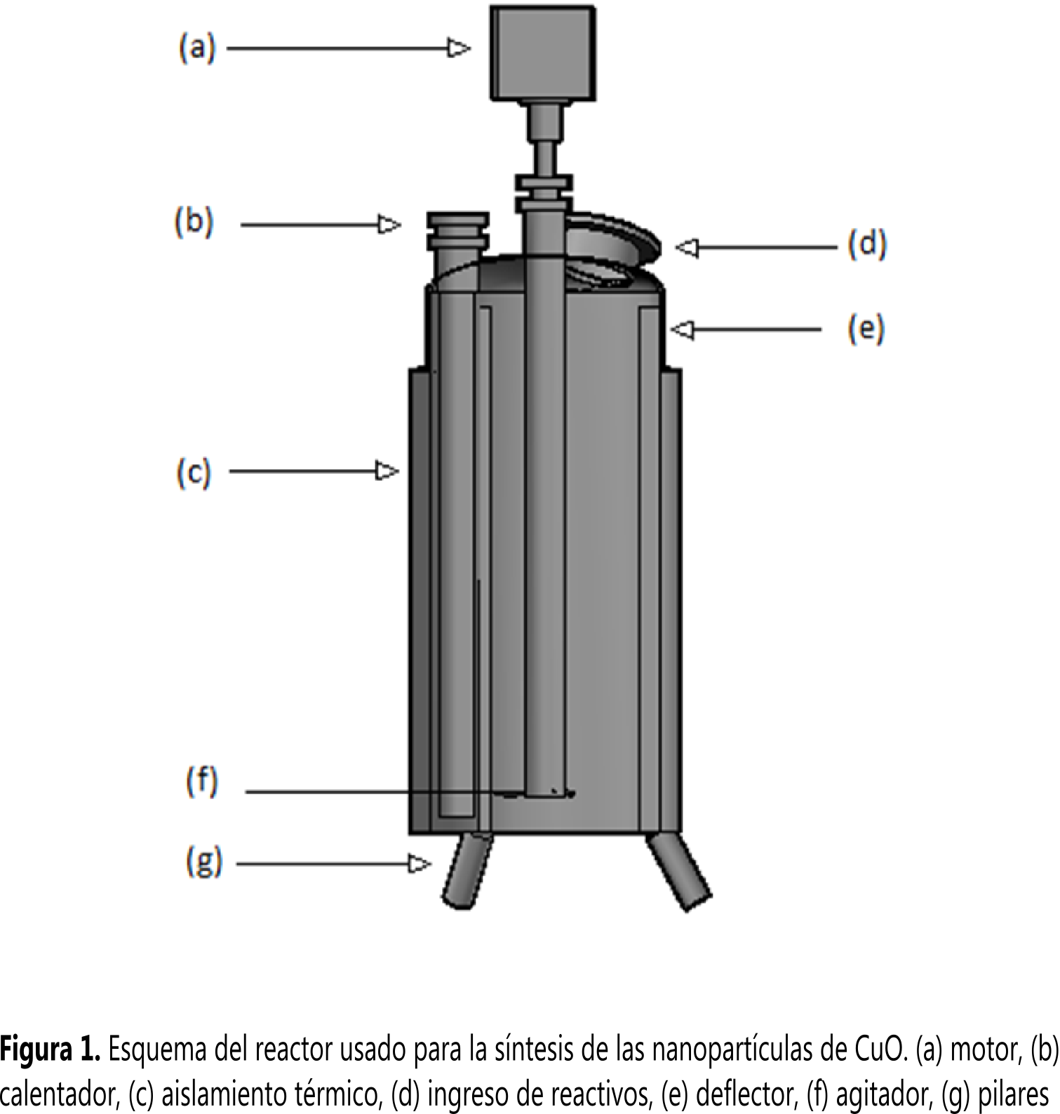 La síntesis se realizó mediante el método de precipitación (16): se preparon soluciones acuosas de 0,02 M a partir de sales precursoras de acetato de cobre monohidratado (Cu(CH3COO)2∙H2O) de grado químicamente puro, Merck Millipore, Alemania y sulfato de cobre pentahidratado (CuSO2∙5H2O) de grado técnico suministrado por la empresa J.A. Elmer, Perú. Luego cada solución de sal precursora preparada se vertió en un reactor piloto de acero inoxidable (33” de altura, 15” de diámetro, motor de 1720 revoluciones por minuto (rpm) y 0,37 kW de potencia, calentador por inmersión Rotkappe® de marca MAZURCZAK) tal como se muestra en la Figura 1. La reacción se inició en 100 °C con agitación vigorosa de 500 rpm, luego se agregó una solución de 0,1 M de hidróxido de sodio (NaOH) con 99,0% de pureza de la marca Merck Millipore, Alemania. Inmediatamente, se observó la formación de un precipitado marrón y para completar la reacción se mantuvo el sistema en agitación por 5 min. Posteriormente, el reactor fue vaciado y las NPs de CuO fueron lavadas 3 veces con agua destilada y secadas a 80 °C. Las NPs de CuO obtenidas a partir de las sales precursoras de Cu(CH3COO)2∙H2O y CuSO2∙5H2O fueron denominadas de CuO-Acet y CuO-Sulf, respectivamente.