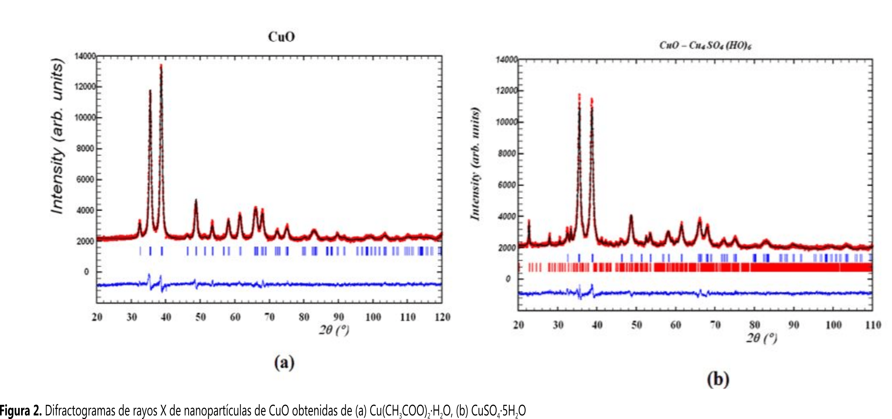 Estos picos, indexados respecto al sistema cristalino monoclínico (grupo espacial C2/c ), archivo N° 45 – 0937 de la base de datos del International Centre for Diffraction Data (ICDD, por sus siglas en inglés), son característicos de las NPs de CuO (8). La medida del tamaño del cristalito fue estimado del refinamiento de Rietveld y la fórmula de Scherrer, con valores de 15 y 19 nm para las NPs de CuO-Acet y CuO-Sulf, respectivamente.