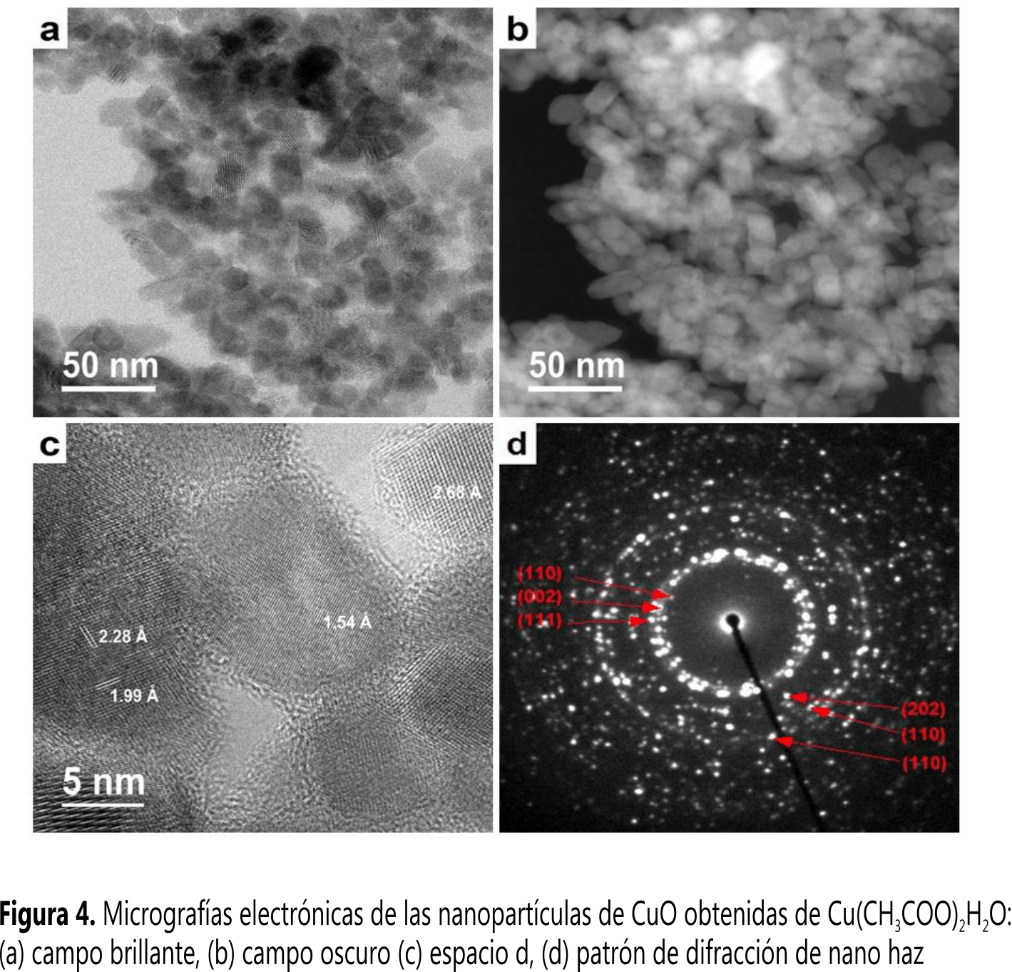 La imagen de la Figura 4c muestra a mayor magnificación la cristalinidad de las partículas. En esta imagen se ven distancias interplanares que corresponden al CuO, cuyos valores están marcados en la imagen. El patrón de difracción de electrones (Figura 4d) corrobora la cristalinidad de las partículas, cuyas intensidades indexan con CuO. Se indican los índices de Miller en la imagen. Esta información es concordante con lo encontrado por XRD.