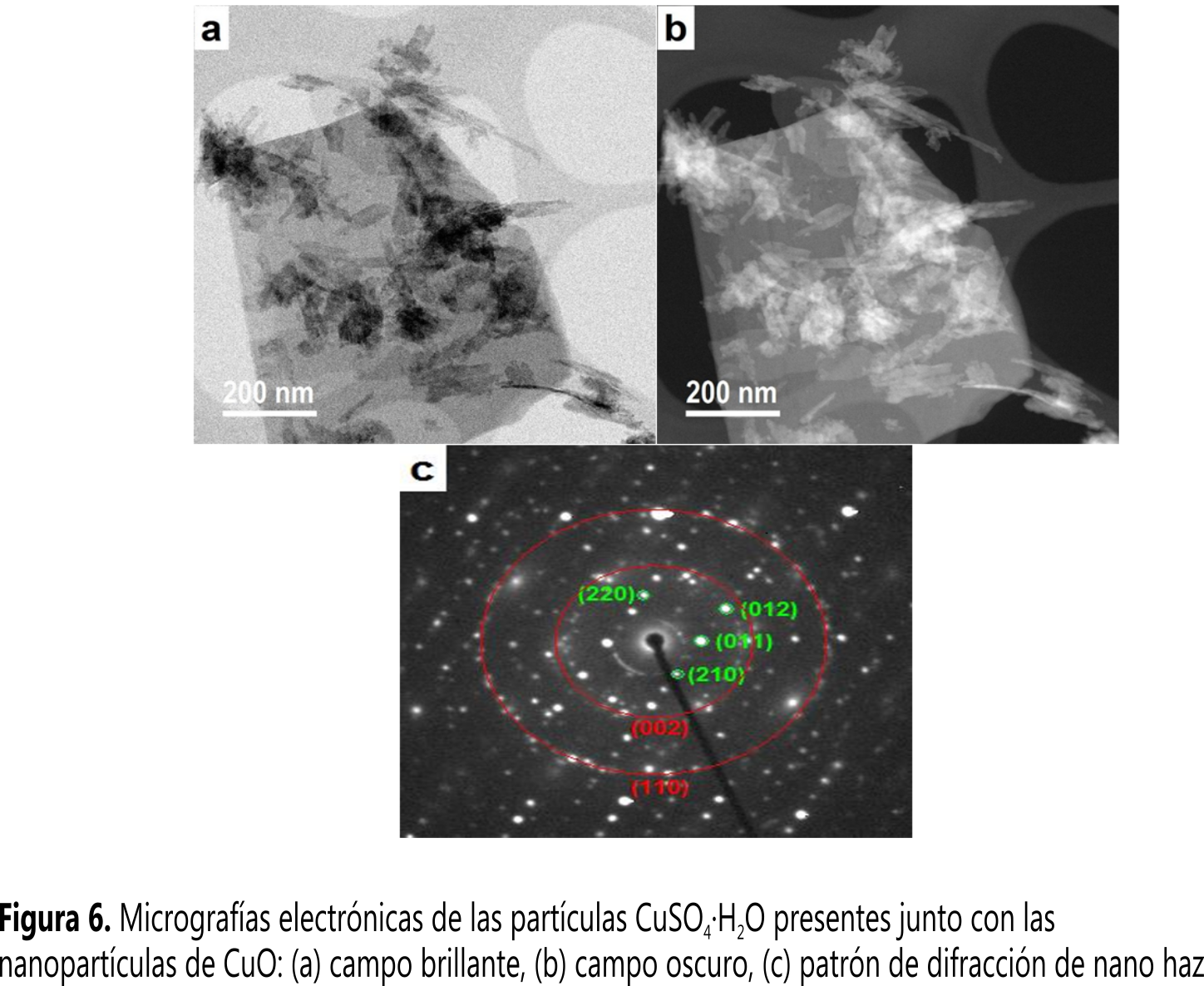 Además de estas partículas, la Figura 6 muestra la imagen de una partícula laminar que no fue encontrada en las imágenes por SEM. La imagen de campo claro (Figura 6a) y campo oscuro (Figura 6b) muestran que se encuentra con las partículas alargadas; la intensidad uniforme en la partícula laminar muestra que tiene un espesor uniforme. En el patrón de difracción de electrones (Figura 6c) se observan intensidades puntuales bien marcadas, las cuales corresponden a la fase de CuSO4·H2O, cuyos índices de Miller están en color verde; las otras intensidades provienen de las partículas alargadas.