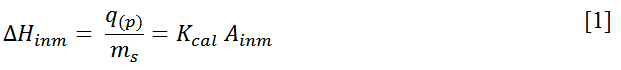 Donde representa el calor total que genera el sistema a presión constante, ms es la masa del carbón activado, Kcal es la constante de calibración del calorímetro y Ainm es el área bajo la curva del pico de inmersión del carbón activado en un líquido de inmersión.