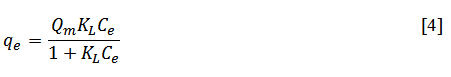 Donde qe representa la cantidad adsorbida en cada punto de concentración, Qm la cantidad máxima adsorbida, Ce la concentración en equilibrio y KLes una contante asociada al modelo.