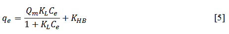 La ecuación [4] difiere de la ecuación [5] en la adición de la constante KHB. Esta constante se considera la capacidad de adsorción asociada a las interacciones por fuerzas de London entre regiones hidrofóbicas del adsorbente y del adsorbato (6).