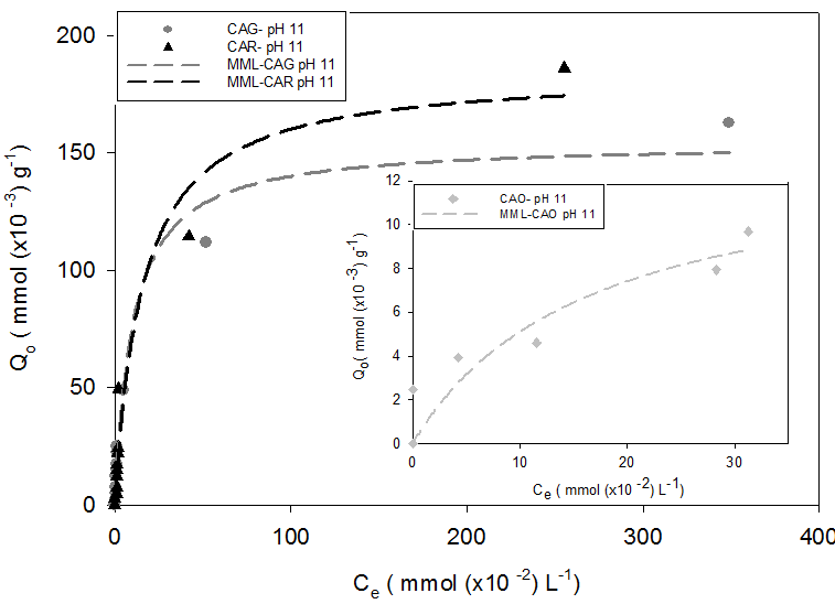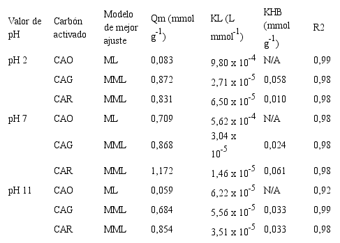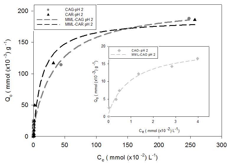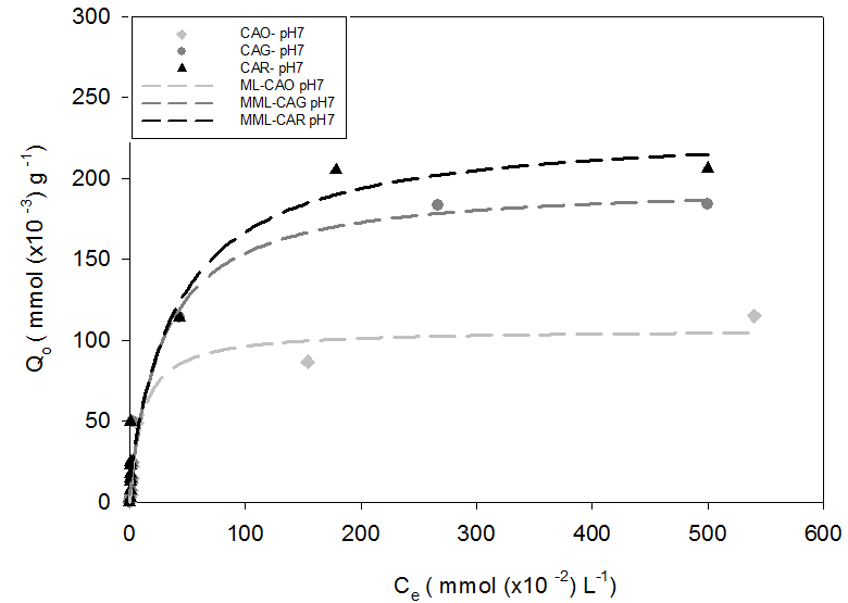 De los resultados obtenidos en la Tabla 3 se observa que la máxima capacidad de adsorción asociada a interacciones específicas se alcanza a pH 7 en el orden CAR > CAG > CAO. Adicionalmente, no todos los datos se ajustan al modelo MML, por ejemplo, la adsorción sobre CAO se ajustó el modelo de Langmuir y se interpreta que el proceso se lleva a cabo en una superficie con alta polaridad y mayor homogeneidad química (alta cantidad de grupos ácidos carboxílicos).