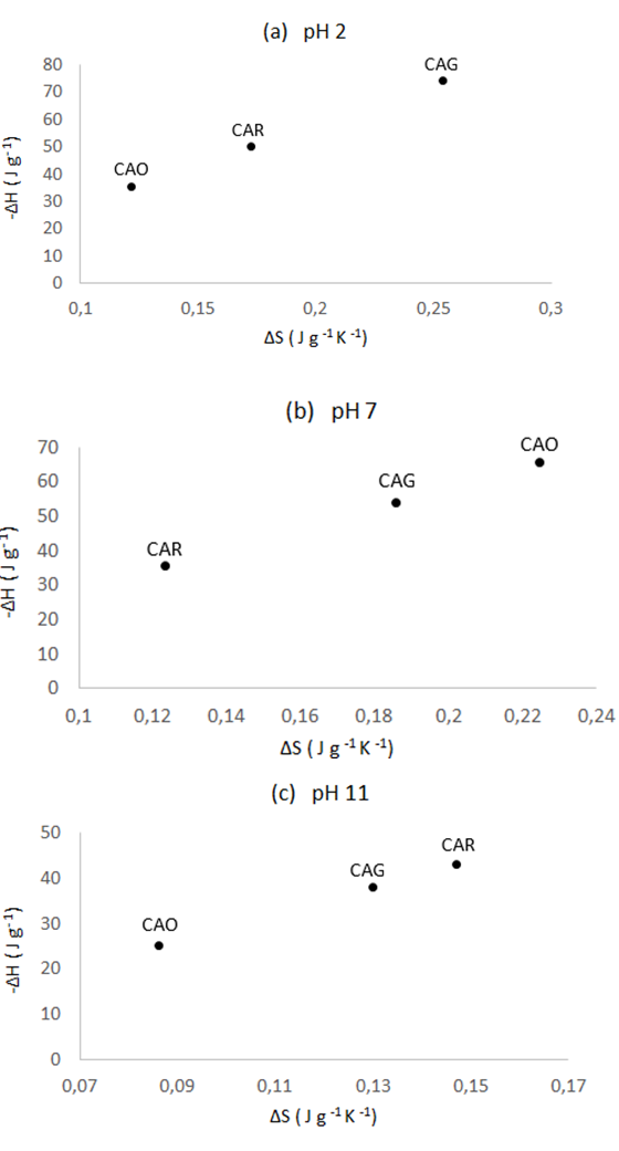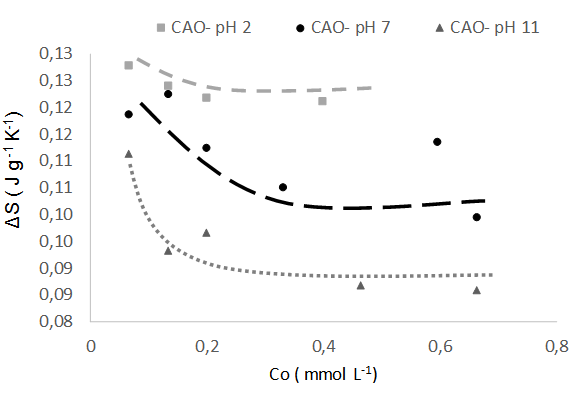 De acuerdo a los datos de la Figura 5, el cambio en la entropía disminuye con el aumento en el pH. Se atribuye este comportamiento a la disminución de interacciones en el sistema debido a que a pH 11 se presentan efectos repulsivos. En el caso de pH 7, el comportamiento es intermedio por la misma razón explicada para el carbón activado CAO. Así mismo, el cambio en la entropía es menor que a pH 2 debido a que hay menos especies en la solución y, por lo tanto, la variación de la entropía está asociada a la formación de interacciones con el adsorbente.