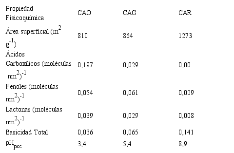 El carbón activado CAR, debido a su proceso de reducción térmica posee menor cantidad de grupos funcionales en la superficie. Se puede ver en la Tabla 2 que este carbón activado no posee una cantidad de grupos ácidos carboxílicos detectables mediante la metodología descrita por Boehm (9). Esto puede ser corroborado si se tiene en cuenta que este grupo funcional presenta inestabilidad térmica a partir de temperaturas mayores a 400 oC, por lo tanto, como la temperatura de reducción seleccionada para este trabajo sobrepasa este límite (900 oC), es posible que se hayan reducido a CO2 todos los ácidos carboxílicos presentes en la muestra CAG.