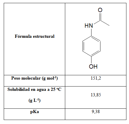 La Tabla 1 muestra las características fisicoquímicas y la estructura química del acetaminofén (N-acetil-p-aminofenol). Esta molécula es un ácido débil con un pKa de 9.4, a este pH la mitad de la concentración del acetaminofén se encuentra en forma el fenolato, tras la disociación del hidrógeno del grupo fenol (11).