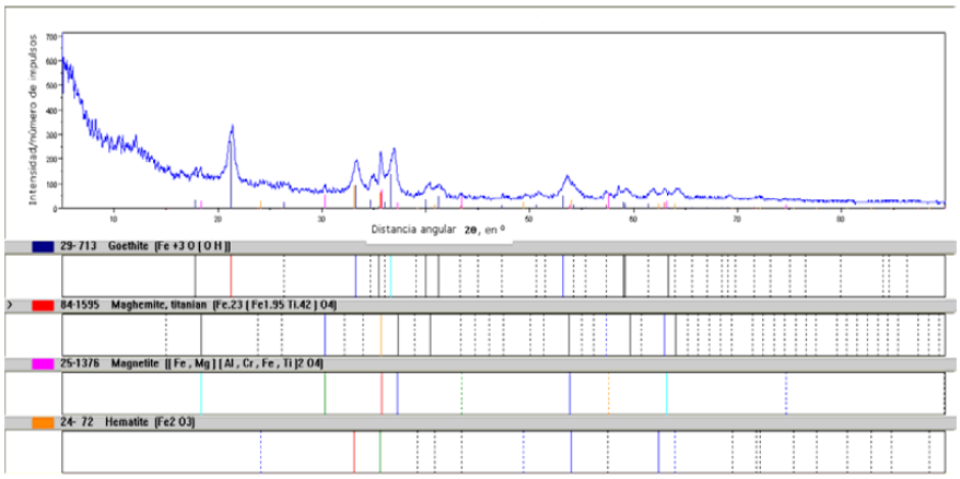 En las determinaciones mineralógicas se detectó que la suspensión de laterita proveniente de la MC1 no contenía gibbsita. Por el contrario, la suspensión de MC2 alcanzó un 8% de esta fase, con pequeñas diferencias en las cantidades de los óxidos de hierro, maghemita y magnetita (Figura 1). Se corroboró que en la laterita cubana, la goethita constituye la fase mineralógica principal, acompañada de otras fases secundarias como la gibbsita, la serpentina, la maghemita, la magnetita y otras en menores proporciones.
