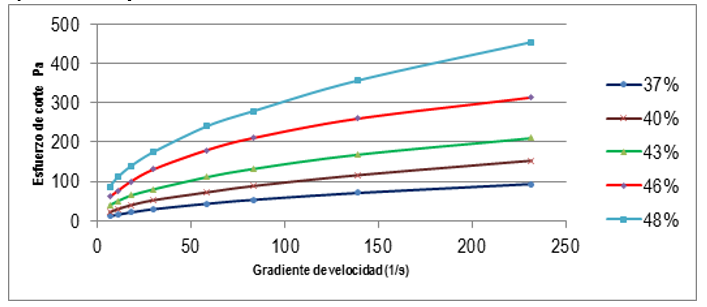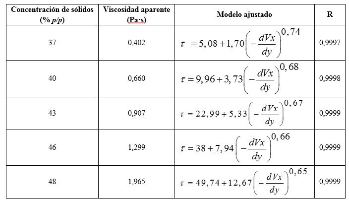 Las curvas de flujos para 37, 40, 46 y 48% p/p de sólidos a diferentes temperaturas presentan un comportamiento similar. Para estas condiciones los resultados experimentales responden al Modelo de Bulkley-Herschell pseudoplástico, donde los coeficientes de regresión de los modelos mínimos cuadrados son mayores que 0,99. Se deduce que los valores de viscosidad aparente, el esfuerzo cortante inicial y el índice de consistencia disminuyen cuando aumenta la temperatura, mientras que los valores de índice de flujo aumentan. Este es el comportamiento típico esperado en la mayoría de los líquidos y suspensiones.