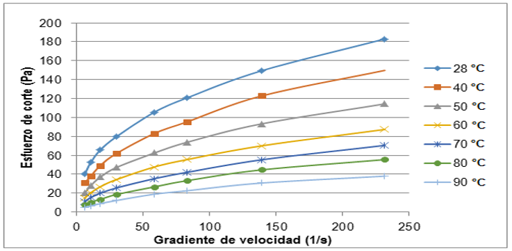 En la Figura 4 se representan las curvas de flujo correspondientes a la muestra MC2 de pulpa. En estos experimentos se varió la temperatura desde 28 a 90 °C, para un valor de concentración de sólidos fijo (43% p/p).