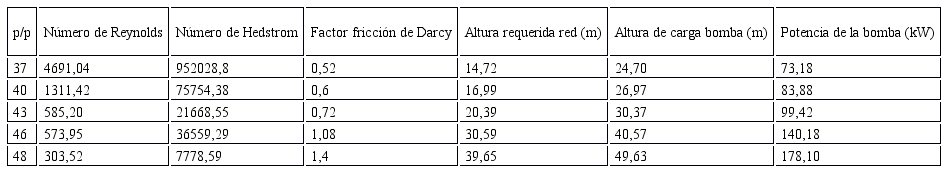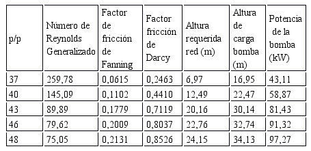 Teniendo en cuenta los datos presentados en la Tabla 7, se aplicó el Balance de Energía Mecánica (BEM) (ver Tabla 8), según las ecuaciones de la metodología plasmada en [22] [23]. Para analizar la influencia de los parámetros reológicos se propuso descomponer el Bingham seudoplástico en dos: un Bingham plástico, con n=1 en los modelos Bulkley-Herschel obtenidos (Tabla 8) y un Seudoplástico, con en la misma ecuación (Tabla 9).