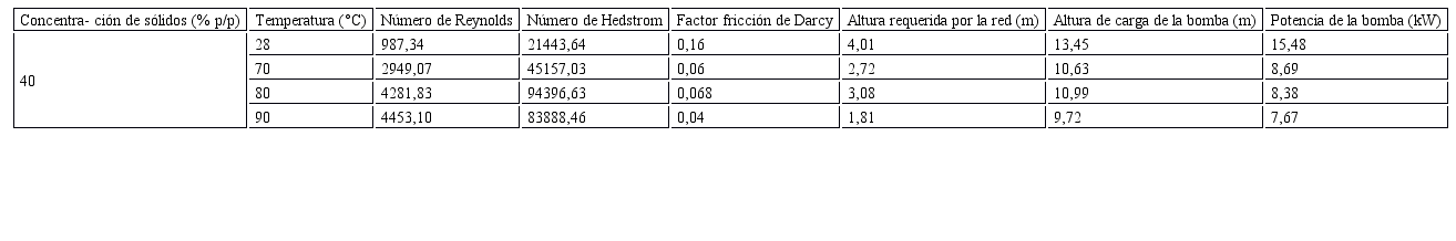 Ahora bien, la pulpa laterítica (materia prima de la extracción de níquel) se caracteriza de acuerdo con las condiciones de la etapa del proceso. Posee diversas cualidades reológicas determinadas por sus propiedades mineralógicas, químicas, granulométricas y físico-mecánicas (densidad, viscosidad y su condición de plasticidad) que determinan su comportamiento como fluido estructurado. Estas pulpas muestran un comportamiento pseudoplástico y características plásticas, debido fundamentalmente a la concentración de sólidos [13], [14]. Este comportamiento incide negativamente en el transporte, ya que implica un aumento de la potencia de bombeo. Por tanto, la concentración total de sólidos, además de ser el factor de mayor incidencia en el comportamiento reológico no newtoniano, afecta el rendimiento del conjunto motor-bomba, cuya correcta valoración exige el conocimiento del modelo reológico, las características de la red hidráulica, potencia hidráulica (Nh) y potencia eléctrica (Nm) [15].