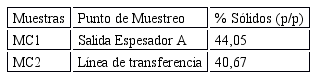 Para la realización de este trabajo se escogieron dos muestras compósito de pulpa laterítica, cada una de 20 L; se tomaron durante 12 h en días alternos. En la Tabla 1 se relacionan los puntos de muestreo y concentración de sólidos. También se tomaron muestras de agua de reboso de los tanques de sedimentación para realizar las diluciones necesarias para la preparación de soluciones con diferentes porcentajes de sólidos 37, 40, 43, 46 y 48% (p/p), los cuales incluyen los valores promedio de la industria, reportados según el control de operaciones.