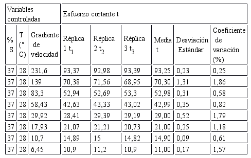 Los resultados obtenidos en el análisis de la muestra del espesador se observan en la Figura 3 y la Tabla 5. Allí se evidencia la tendencia de los parámetros reológicos al aumentar las concentraciones de sólidos a temperatura ambiente: se incrementa la viscosidad aparente, el esfuerzo cortante inicial y el índice de consistencia, mientras disminuye el índice de flujo.