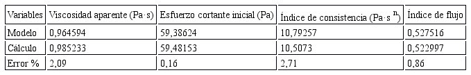 Tiene especial interés comprobar la sensibilidad de todo el procedimiento. Para ello se demostró a partir de datos medidos en la etapa experimental que, con pequeños cambios en los datos de entrada, se producen cambios de igual escala en los pronósticos hechos por los modelos de los parámetros reológicos propuestos (ver Tabla 6).