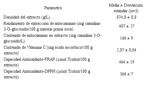 La Tabla 1 muestra la capacidad antioxidante y el contenido de antocianinas del extracto extraído.