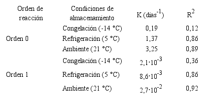 El orden de la cinética de degradación de las antocianinas durante el almacenamiento se definió por la cinética de orden uno (Tabla 2). Para esto, se graficó, en función del tiempo, el logaritmo en base Euler de la razón entre la concentración de antocianinas del tiempo dado y la concentración inicial del extracto (Figura 1A). El ensayo sometido a temperatura de congelación no fue significativo para ningún orden de reacción según ANAVA (p<0,05), lo cual muestra que el extracto bajo tales condiciones de almacenamiento no sufrió cambios durante el tiempo de experimentación.