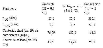 El tiempo de vida media para el extracto almacenado en temperatura de refrigeración (Tabla 3) fue similar al del jugo de arándanos (Vaccinium corymbosum L. “Snowchaser”) sin pasteurizar a 5 °C (75 días) [34], mientras que con jugo y concentrado de agraz (Vaccinuim meridionale Sw.) a 17 °C se reportó un t1/2 entre 1,8 y 6,4 semanas [35]. Lo anterior responde al carácter termolábil de las antocianinas [36], reflejando tiempos de vida inferiores para temperaturas superiores.