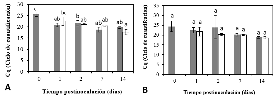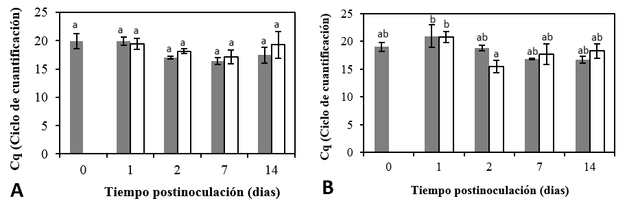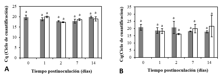 Niveles transcripcionales de ARNr18s en raíz de dos variedades de clavel con diferencias en los niveles de resistencia al marchitamiento vascular. Figura A: Golem (Resistente) y Figura B: Solex (Susceptible) respectivamente a diferentes tiempos posinoculación con Fod. Los colores gris y blanco corresponden a los tratamientos control e inoculado respectivamente. Los grupos estadísticamente diferentes se señalan con letras diferentes (p<0.05) con n igual a 3.