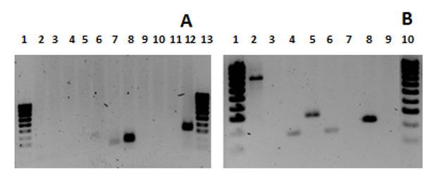 Gel de electroforesis horizontal en agarosa al 1,5% de los amplímeros, usando ADN genómico extraído de tallo de la variedad resistente Golem como plantilla para la evaluación de los cebadores. Gel A Carril: 1 y 13 (marcador de peso molecular hypperlader IV ™, 100-1000 bp); 2-6 (gapdh1, gapdh2 gapdh3, gapdh4, gapdh5); 7-8 (histona1, histona 2); 9-11 (pux1.3, pux 1,1, pux 1,2); 12 (control positivo DcPrx02). Gel B Carril: 1 y 10 (marcador de peso molecular hypperlader IV ™); 2-6 (gapdh1, gapdh2 gapdh3, gapdh4, gapdh5); 7-9(pux1.3, pux 1,1, pux 1,2).
