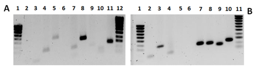 Geles de electroforesis horizontal en agarosa al 1,5% de los amplímeros obtenidos, usando ADN genómico extraído de tallo de la variedad resistente Golem como plantilla para la evaluación de los cebadores diseñados Gel A Carril: 1y 12 (marcador de peso molecular hypperlader IV ™, 100-1000 bp); 2-6 (ubq-1, ubq-2, ubq-3, ubq-4, ubq-5); 7-11 (efα1.1, efα1.2, efα1.3, efα1.4, efα1.5) Gel B Carril: 1y 11 (marcador de peso molecular hypperlader IV ™);2-5 (pr13s-1, pr13s-2, pr13s-3, pr13s-4); 6-10 (ARN18s-1, ARN18s-2, ARN18s-3, ARN18s-4, ARN18s-5).