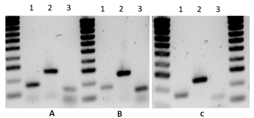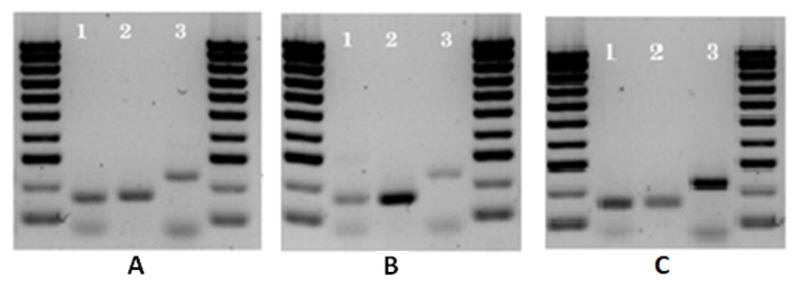 Geles de electroforesis horizontal en agarosa al 1,5% de los amplímeros, usando ADNc obtenidos a partir de ARN total extraído de tallo, raíces y hojas como plantilla para la evaluación de la expresión constitutiva y sintetizados para el ensayo de RT-qPCR, marcador de peso molecular hypperlader IV ™, 100-1000 bp. Figura A: Raíz. Figura B: Tallo. Figura C: Hoja. Carril: (1) pr13s, (2) 18s, (3) ubq.