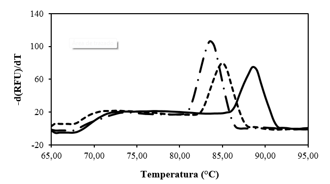 Resultados obtenidos para las curvas de fusión, empleando los cebadores diseñados para la evaluación de los niveles transcripcionales. Las líneas continua, segmentada y punteada corresponden respectivamente a los genes ARNr18S, histona y peroxidasa como control positivo.