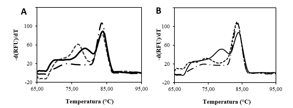 Resultados obtenidos para las curvas de fusión, empleando los cebadores diseñados para la evaluación de los niveles transcripcionales. En la figura A, las líneas continua, segmentada y punteada corresponden respectivamente a los genes pr13s y gadph y peroxidasa como control positivo. En la figura B, las líneas continua, segmentada y punteada corresponden respectivamente a los genes ubq, pux y peroxidasa como control positivo.